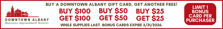 Select the value of your Downtown Albany Gift Card. Choose your recipient (family, friends, team members) and send via email or text message. Immediately redeemable, the recipient can use that value at all participating locations.