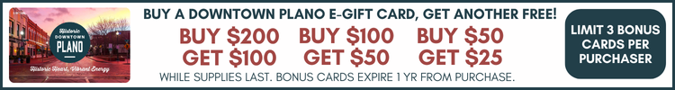 Select the value of your Downtown Plano E-Gift Card. Choose your recipient (personal or professional contacts) and send via email. The recipient can purchase from the many participating Downtown Plano merchants below.